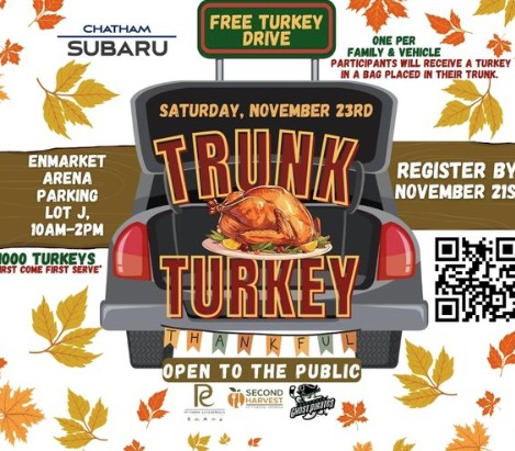 Trunk Turkey giveaway. Up to 1000 turkeys for the holidays. First come first serve. Located in the parking lot J at Enmarket Arena.